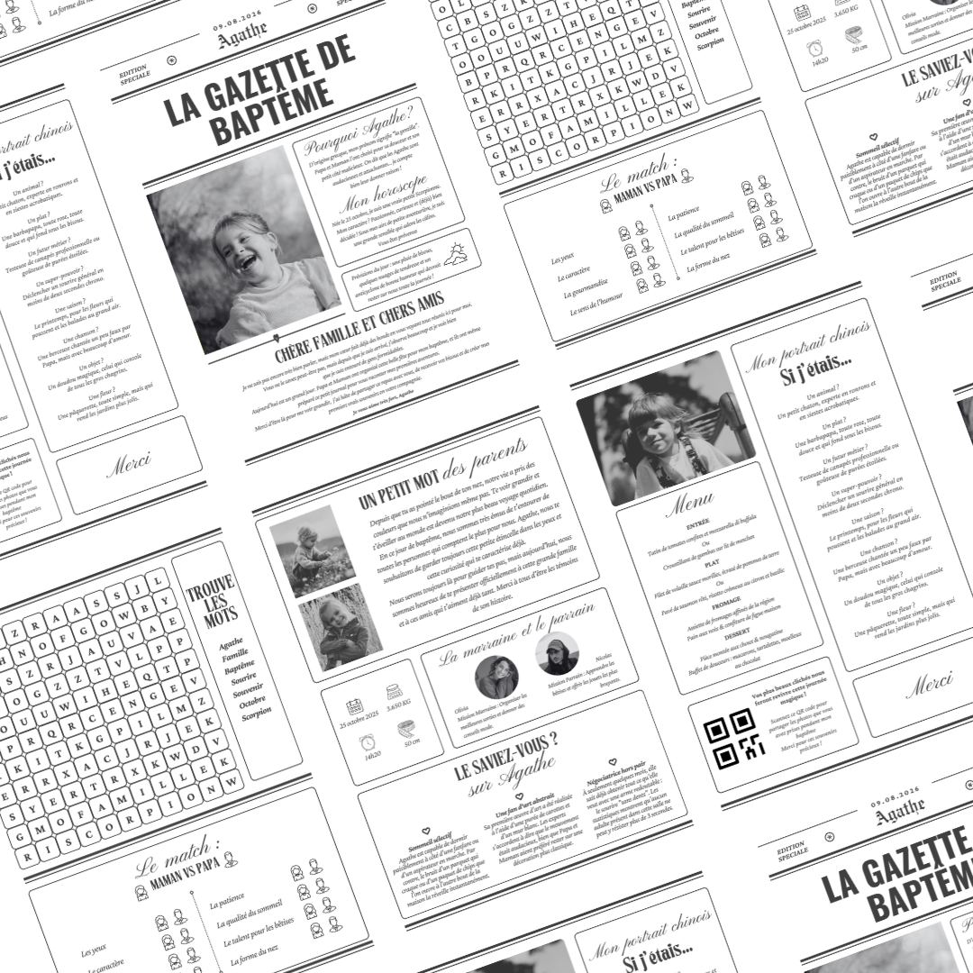 Offrez à vos invités une touche originale et ludique avec cette Gazette de Baptême, un template Canva facile à personnaliser et à imprimer soi-même. Composée de 4 pages, elle contient des jeux, des anecdotes et des espaces photos, parfaits pour divertir vos convives et créer une ambiance conviviale à table.
