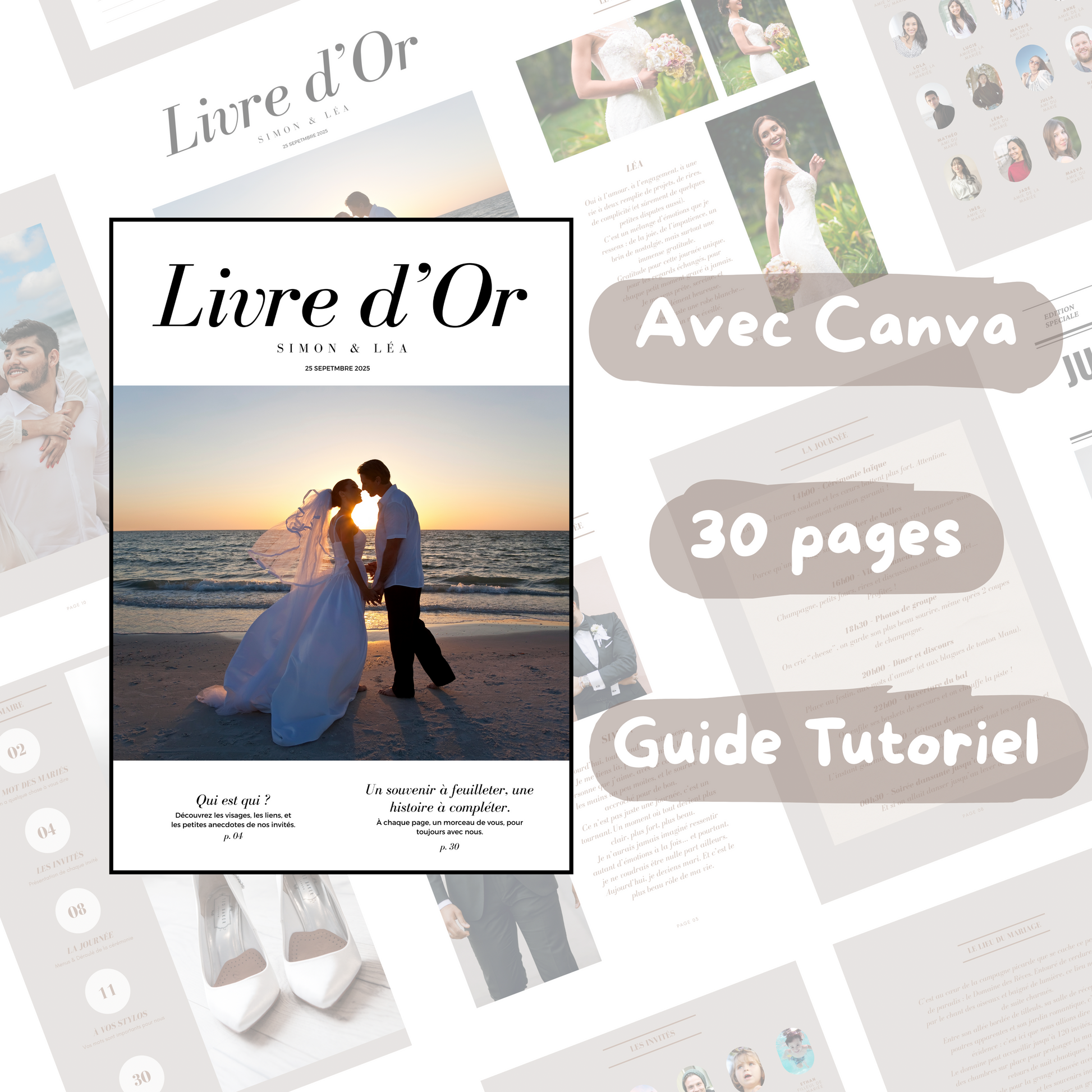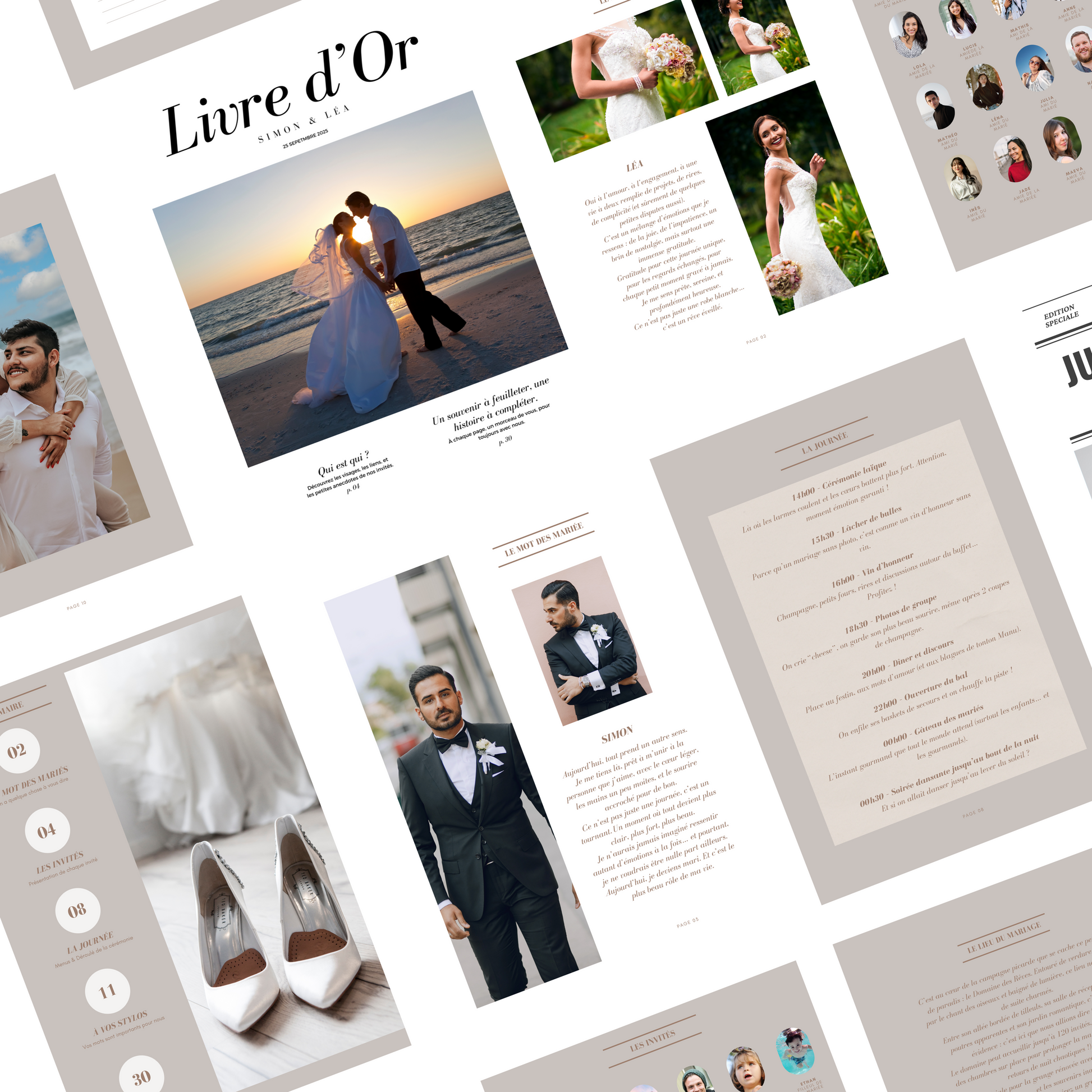 Créez un souvenir unique et rempli d’émotion avec ce template numérique de livre d’or personnalisable de 30 pages spécialement conçu pour les mariages. Parfait pour recueillir les mots tendres, anecdotes et vœux de vos proches, il deviendra un trésor à feuilleter encore et encore au fil des années.